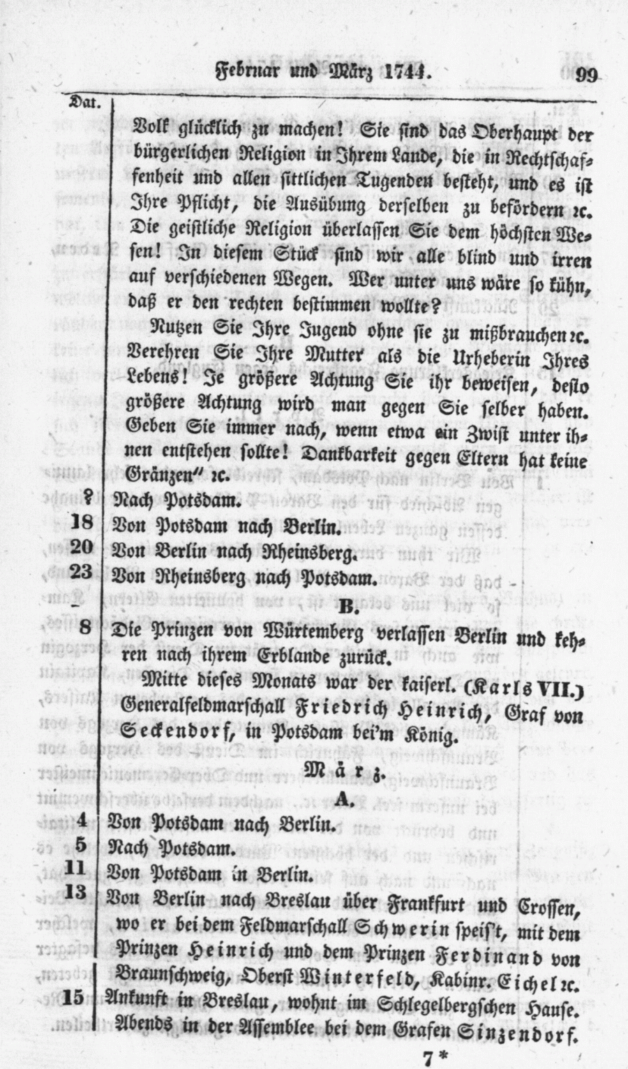 "<99> Volk glücklich zu machen! Sie sind das Oberhaupt der bürgerlichen Religion in Ihrem Lande, die in Rechtschaffenheit und allen sittlichen Tugenden besteht, und es ist Ihre Pflicht, die Ausübung derselben zu befordern etc. Die geistliche Religion überlassen Sie dem höchsten Wesen! In diesem Stück sind wir alle blind und irren auf verschiedenen Wegen. Wer unter uns wäre so kühn, daß er den rechten bestimmen wollte? Nutzen Sie Ihre Jugend ohne sie zu mißbrauchen etc. Verehren Sie Ihre Mutter als die Urheberin Ihres Lebens! Je größere Achtung Sie ihr beweisen, desto größere Achtung wird man gegen Sie selber haben. Geben Sie immer nach, wenn etwa ein Zwist unter ihnen entstehen sollte! Dankbarkeit gegen Eltern hat keine Gränzen" etc.