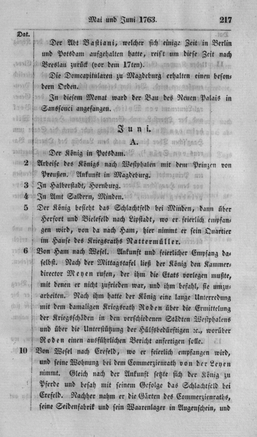 Von Ham nach Wesel. Ankunft und feierlicher Empfang daselbst. Nach der Mittagstafel ließ der König den Kammerdirector Meyen rufen, der ihm die Etats vorlegen mußte, mit denen er nicht zufrieden war, und ihm befahl, sie umzuarbeiten. Nach ihm hatte der König eine lange Unterredung mit dem damaligen Kriegsrath Roden über die Ermittelung der Kriegsschäden in den verschiedenen Städten Westphalens und über die Unterstützung der Hülfsbedürftigen etc., worüber Roden einen ausführlichen Bericht anfertigen solle.
