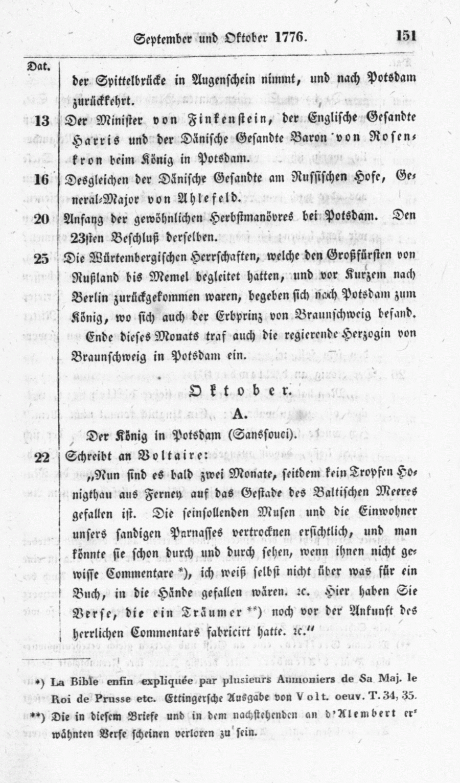 Schreibt an Voltaire: "Nun sind es bald zwei Monate, seitdem kein Tropfen Honigthau aus Ferney auf das Gestade des Baltischen Meeres gefallen ist. Die seinsollenden Musen und die Einwohner unsers sandigen Parnasses vertrocknen ersichtlich, und man könnte sie schon durch und durch sehen, wenn ihnen nicht gewisse Commentare +, ich weiß selbst nicht über was für ein Buch, in die Hände gefallen wären. etc. Hier haben Sie Verse, die ein Träumer ++ noch vor der Ankunft des herrlichen Commentars fabricirt hatte. etc."
