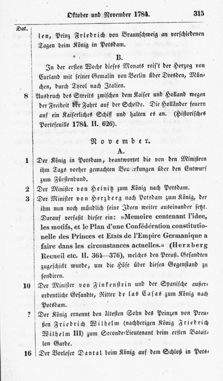 <315>len, Prinz Friedrich von Braunschweig an verschiedenen Tagen beim König in Potsdam.