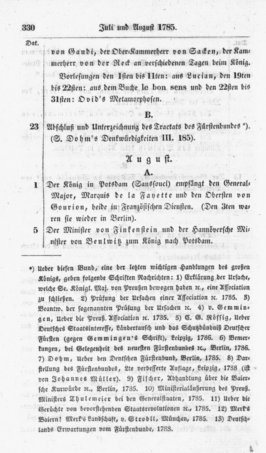 + Ueber diesen Bund, eine der letzten wichtigen Handlungen des großen Königs, geben folgende Schriften Nachrichten: 1) Erklärung der Ursache, welche Se. Königl. Maj. von Preußen bewogen haben etc., eine Association zu schließen. 2) Prüfung der Ursachen einer Association etc. 1785. 3) Beantw. der sogenannten Prüfung der Ursachen etc. 4) v. Gemmingen, Ueber die Preuß. Association etc. 1735. 5) C. G. Rössig, ueber Deutsches Staatsinteresse, Ländertausch und das Schutzbündniß Deutscher Fürsten (gegen Gemmingen's Schrift), Leipzig, 1786. 6) Bemerkungen, bei Gelegenheit des neuesten Fürstenbundes etc., Berlin, 1786. 7) Dohm, Ueber den Deutschen Fürstenbund, Berlin, 1785. 8) Darstellung des Fürstenbundes, 2te verbesserte Auflage, Leipzig, 1738 (ist von Johannes Müller). 9) Fischer, Abhandlung über die Baiersche Kurwürde etc., Berlin, 1785. 10) Ministerialäußerung des Preuß. Ministers Thulemeier bei den Generalstaaten, 1785. 11) Ueber die Gerüchte von bevorstehenden Staatsrevolutionen etc., 1785. 12) Merk's Baiern! Merk's Landschaft, v. Strobll, München, 1785. 13) Deutschlands Erwartungen vom Fürstenbunde, 1783.