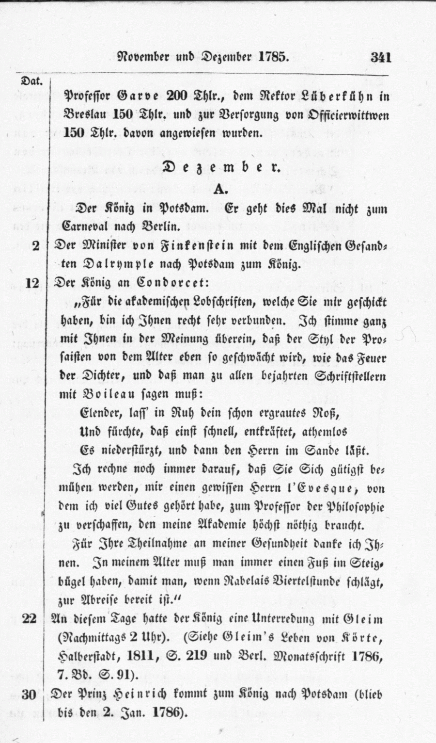 Der König an Condorcet: "Für die akademischen Lobschriften, welche Sie mir geschickt haben, bin ich Ihnen recht sehr verbunden. Ich stimme ganz mit Ihnen in der Meinung überein, daß der Styl der Prosaisten von dem Alter eben so geschwächt wird, wie das Feuer der Dichter, und daß man zu allen bejahrten Schriftstellern mit Boileau sagen muß: Elender, lass' in Ruh dein schon ergrautes Roß, Und fürchte, daß einst schnell, entkräftet, athemlos Es niederstürzt, und dann den Herrn im Sande läßt. Ich rechne noch immer darauf, daß Sie Sich gütigst bemühen werden, mir einen gewissen Herrn l'Evesque, von dem ich viel Gutes gehört habe, zum Professor der Philosophie zu verschaffen, den meine Akademie höchst nöthig braucht. Für Ihre Theilnahme an meiner Gesundheit danke ich Ihnen. In meinem Alter muß man immer einen Fuß im Steigbügel haben, damit man, wenn Rabelais Viertelstunde schlägt, zur Abreise bereit ist."