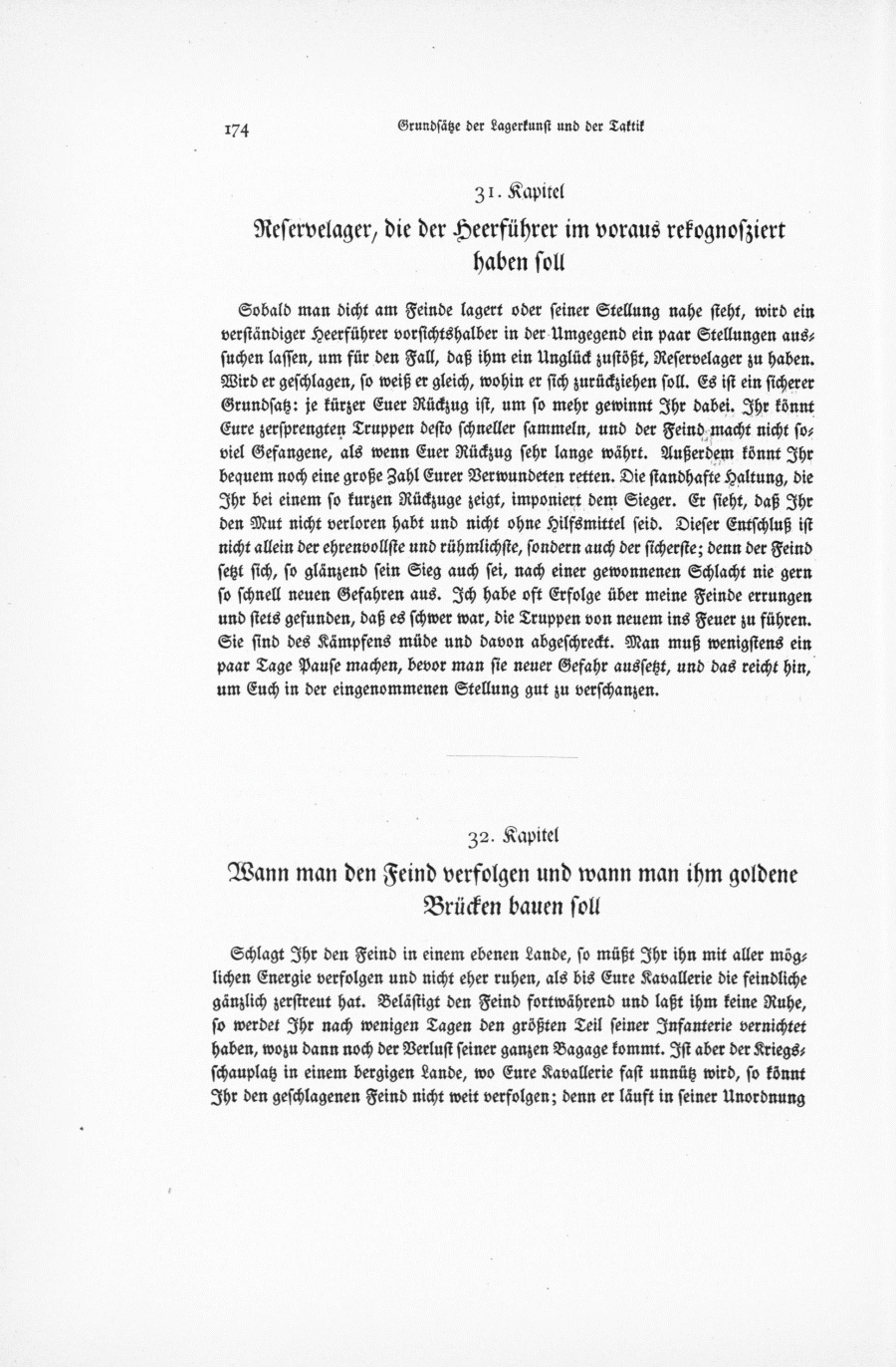 Schlagt Ihr den Feind in einem ebenen Lande, so müßt Ihr ihn mit aller möglichen Energie verfolgen und nicht eher ruhen, als bis Eure Kavallerie die feindliche gänzlich zerstreut hat. Belästigt den Feind fortwährend und laßt ihm keine Ruhe, so werdet Ihr nach wenigen Tagen den größten Teil seiner Infanterie vernichtet haben, wozu dann noch der Verlust seiner ganzen Bagage kommt. Isi aber der Kriegsschauplatz in einem bergigen Lande, wo Eure Kavallerie fast unnütz wird, so könnt Ihr den geschlagenen Feind nicht weit verfolgen; denn er läuft in seiner Unordnung