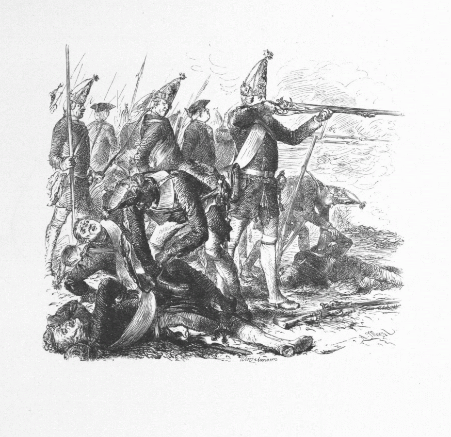13. Les grenadiers de Frédéric II sur le champ de bataille. (Chapt. III de l'„Histoire de mon temps“. - Gravure d'Unzelmann.)