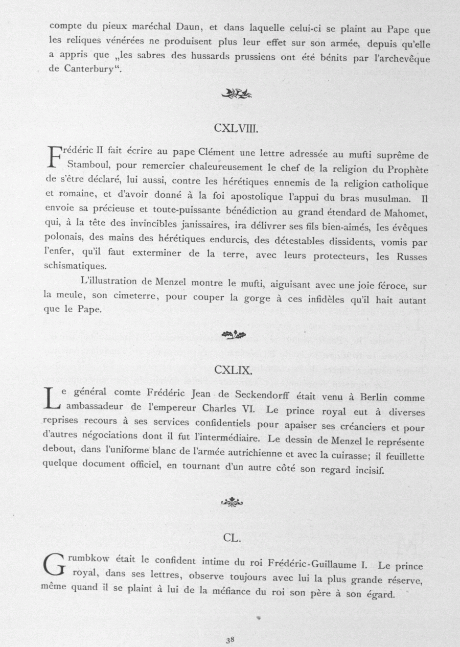 <38>compte du pieux maréchal Daun, et dans laquelle celui-ci se plaint au Pape que les reliques vénérées ne produisent plus leur effet sur son armée, depuis qu'elle a appris que „les sabres des hussards prussiens ont été bénits par l'archevêque de Canterbury“ .