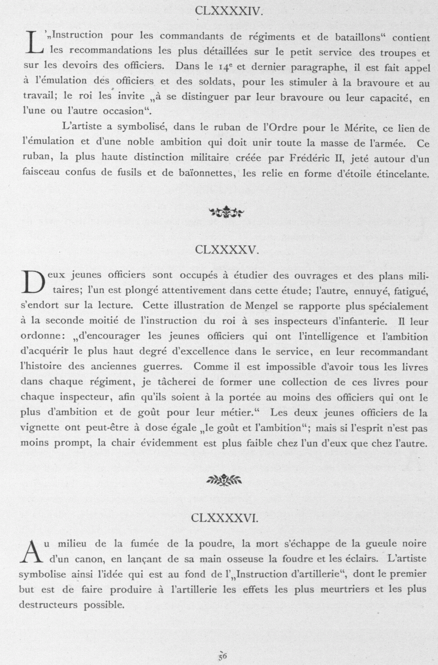 Deux jeunes officiers sont occupés à étudier des ouvrages et des plans mili-taires; l'un est plongé attentivement dans cette étude; l'autre, ennuyé, fatigué, s'endort sur la lecture. Cette illustration de Menzel se rapporte plus spécialement à la seconde moitié de l'instruction du roi à ses inspecteurs d'infanterie. Il leur ordonne: „d'encourager les jeunes officiers qui ont l'intelligence et l'ambition d'acquérir le plus haut degré d'excellence dans le service, en leur recommandant l'histoire des anciennes guerres. Comme il est impossible d'avoir tous les livres dans chaque régiment, je tâcherei de former une collection de ces livres pour chaque inspecteur, afin qu'ils soient à la portée au moins des officiers qui ont le plus d'ambition et de goût pour leur métier.“ Les deux jeunes officiers de la vignette ont peut-être à dose égale „le goût et l'ambition“ ; mais si l'esprit n'est pas moins prompt, la chair évidemment est plus faible chez l'un d'eux que chez l'autre.