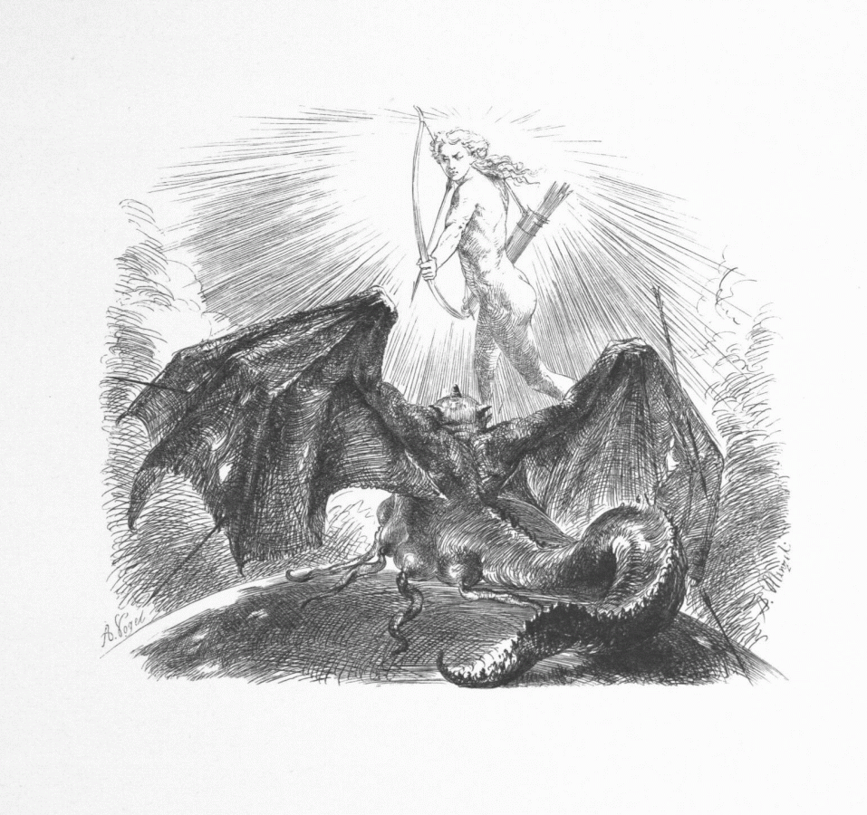 173. Lutte d'Apollon contre le dieu des Ténèbres. („Correspondance de Frédéric avec d'Alembert“. - Gravure d'A. Vogel.)