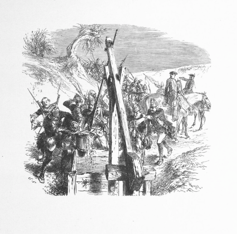 191. Soldats en marche se désaltérant à un puits. („Des Marches d'armées et de ce qu'il faut observer à cet égard“. - Gravure d'O. Vogel.)