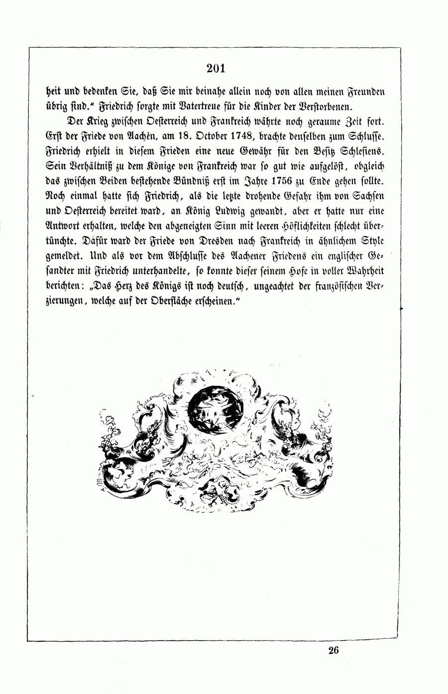 Der Krieg zwischen Österreich und Frankreich währte noch geraume Zeit fort. Erst der Friede von Aachen, am 18. Oktober 1748, brachte denselben zum Schluß. Friedrich erhielt in diesem Frieden eine neue Gewähr für den Besitz Schlesiens. Sein Verhältnis zu dem Könige von Frankreich war so gut wie aufgelöst, obgleich das zwischen beiden bestehende Bündnis erst im Jahre 1756 zu Ende gehen sollte. Noch einmal hatte sich Friedrich, als die letzte drohende Gefahr ihm von Sachsen und Österreich bereitet ward, an König Ludwig gewandt, aber er hatte nur eine Antwort erhalten, die den abgeneigten Sinn mit leeren Höflichkeiten schlecht übertünchte. Dafür ward dem letztern der Friede von Dresden in ähnlichem Stile gemeldet. Und als, vor dem Abschluß des Aachener Friedens, ein englischer Gesandter mit Friedrich unterhandelte, so konnte dieser seinem Hofe in voller Wahrheit berichten: « Das Herz des Königs ist noch deutsch, ungeachtet der französischen Verzierungen, welche auf der Oberfläche erscheinen. »