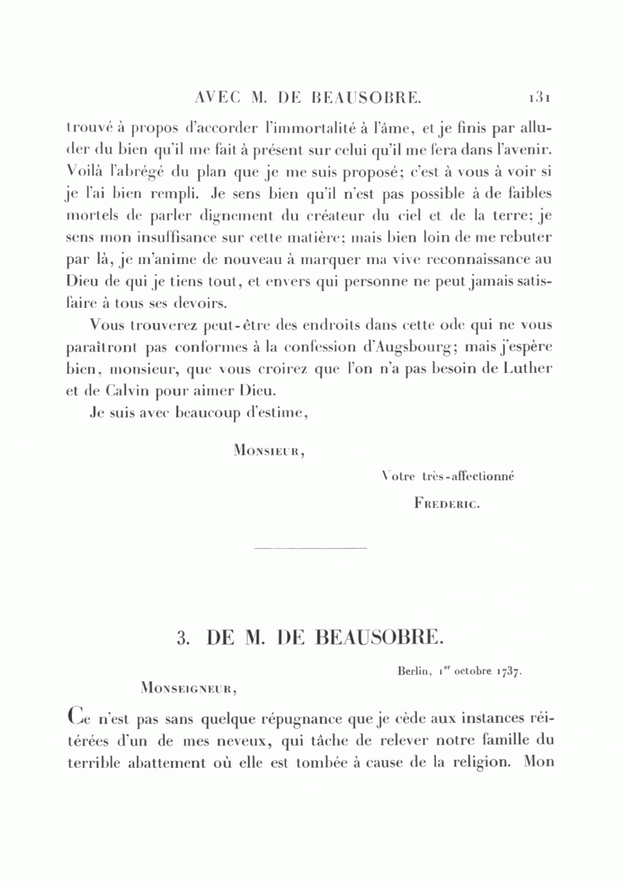 Vous trouverez peut-être des endroits dans cette ode qui ne vous paraîtront pas conformes à la confession d'Augsbourg; mais j'espère bien, monsieur, que vous croirez que l'on n'a pas besoin de Luther et de Calvin pour aimer Dieu.