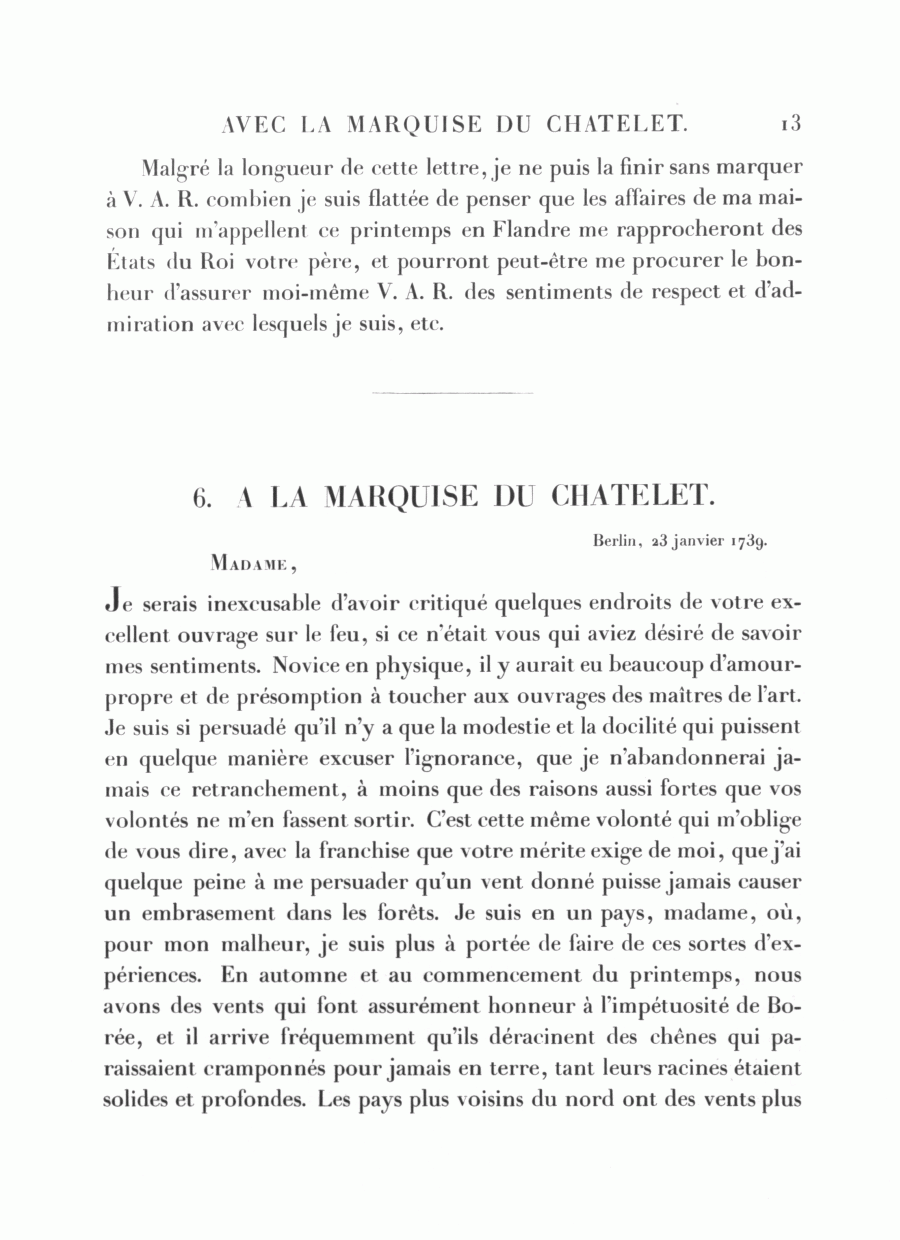 Je serais inexcusable d'avoir critiqué quelques endroits de votre excellent ouvrage sur le feu, si ce n'était vous qui aviez désiré de savoir mes sentiments. Novice en physique, il y aurait eu beaucoup d'amour-propre et de présomption à toucher aux ouvrages des maîtres de l'art. Je suis si persuadé qu'il n'y a que la modestie et la docilité qui puissent en quelque manière excuser l'ignorance, que je n'abandonnerai jamais ce retranchement, à moins que des raisons aussi fortes que vos volontés ne m'en fassent sortir. C'est cette même volonté qui m'oblige de vous dire, avec la franchise que votre mérite exige de moi, que j'ai quelque peine à me persuader qu'un vent donné puisse jamais causer un embrasement dans les forêts. Je suis en un pays, madame, où, pour mon malheur, je suis plus à portée de faire de ces sortes d'expériences. En automne et au commencement du printemps, nous avons des vents qui font assurément honneur à l'impétuosité de Borée, et il arrive fréquemment qu'ils déracinent des chênes qui paraissaient cramponnés pour jamais en terre, tant leurs racines étaient solides et profondes. Les pays plus voisins du nord ont des vents plus