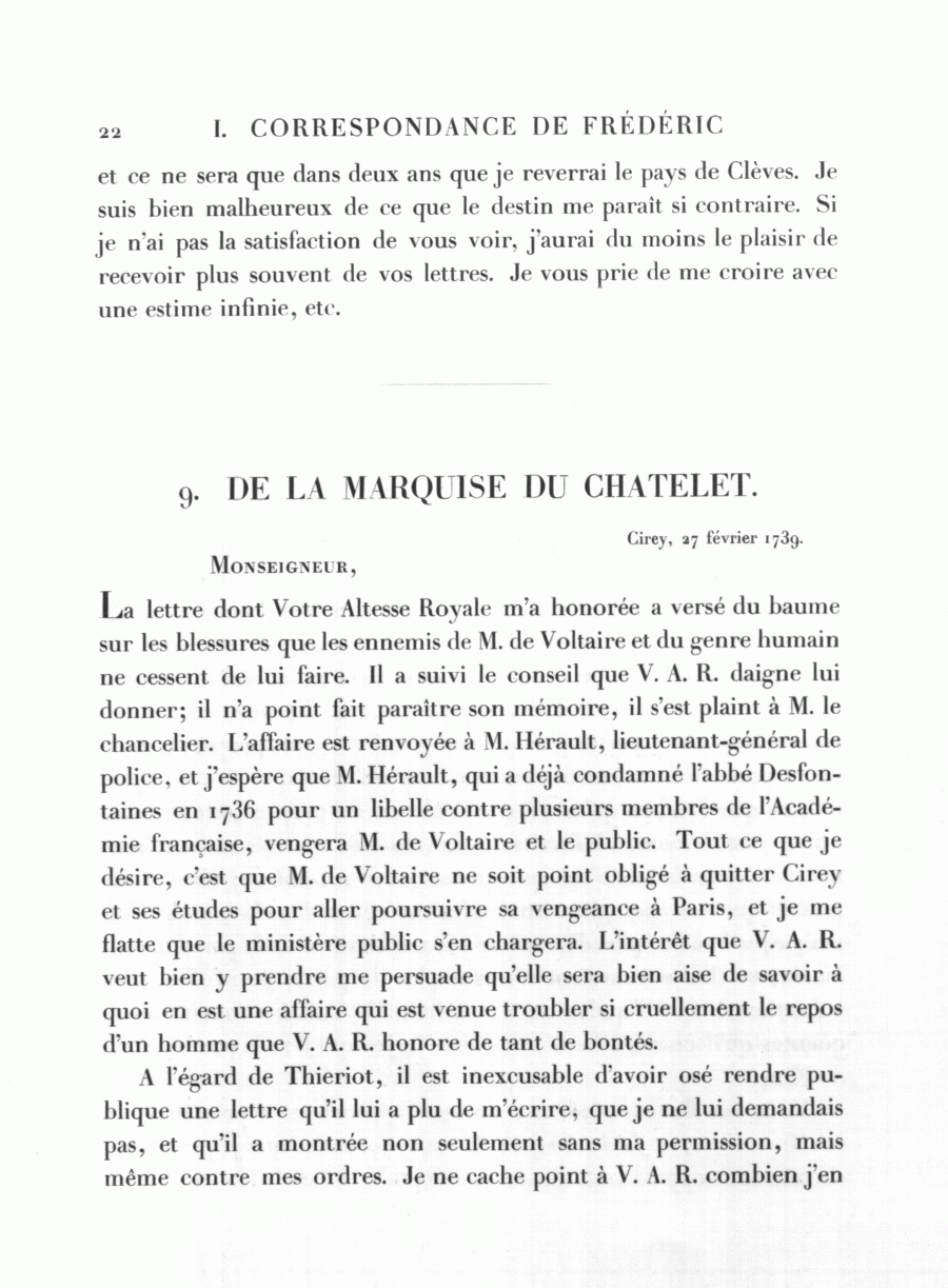 La lettre dont Votre Altesse Royale m'a honorée a versé du baume sur les blessures que les ennemis de M. de Voltaire et du genre humain ne cessent de lui faire. Il a suivi le conseil que V. A. R. daigne lui donner; il n'a point fait paraître son mémoire, il s'est plaint à M. le chancelier. L'affaire est renvoyée à M. Hérault, lieutenant-général de police, et j'espère que M. Hérault, qui a déjà condamné l'abbé Desfontaines en 1736 pour un libelle contre plusieurs membres de l'Académie française, vengera M. de Voltaire et le public. Tout ce que je désire, c'est que M. de Voltaire ne soit point obligé à quitter Cirey et ses études pour aller poursuivre sa vengeance à Paris, et je me flatte que le ministère public s'en chargera. L'intérêt que V. A. R. veut bien y prendre me persuade qu'elle sera bien aise de savoir à quoi en est une affaire qui est venue troubler si cruellement le repos d'un homme que V. A. R. honore de tant de bontés.