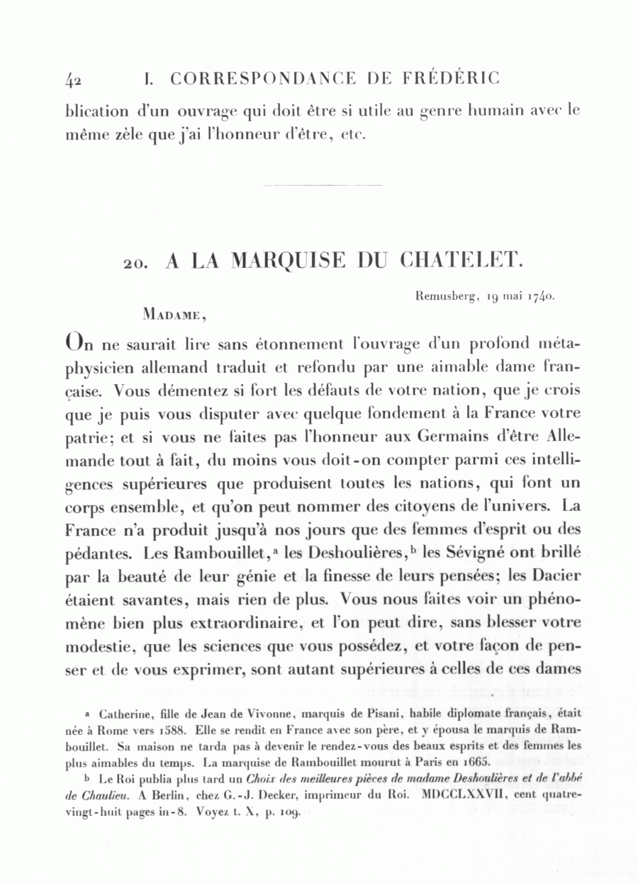 On ne saurait lire sans étonnement l'ouvrage d'un profond métaphysicien allemand traduit et refondu par une aimable dame française. Vous démentez si fort les défauts de votre nation, que je crois que je puis vous disputer avec quelque fondement à la France votre patrie; et si vous ne faites pas l'honneur aux Germains d'être Allemande tout à fait, du moins vous doit-on compter parmi ces intelligences supérieures que produisent toutes les nations, qui font un corps ensemble, et qu'on peut nommer des citoyens de l'univers. La France n'a produit jusqu'à nos jours que des femmes d'esprit ou des pédantes. Les Rambouillet,a les Deshoulières,b les Sévigné ont brillé par la beauté de leur génie et la finesse de leurs pensées; les Dacier étaient savantes, mais rien de plus. Vous nous faites voir un phénomène bien plus extraordinaire, et l'on peut dire, sans blesser votre modestie, que les sciences que vous possédez, et votre façon de penser et de vous exprimer, sont autant supérieures à celles de ces dames