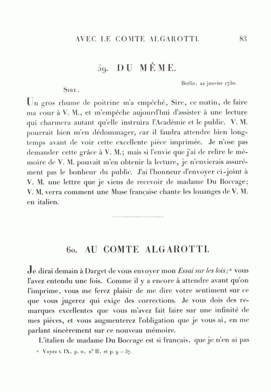 Frédéric au comte Algarotti, (22 janvier 1750)