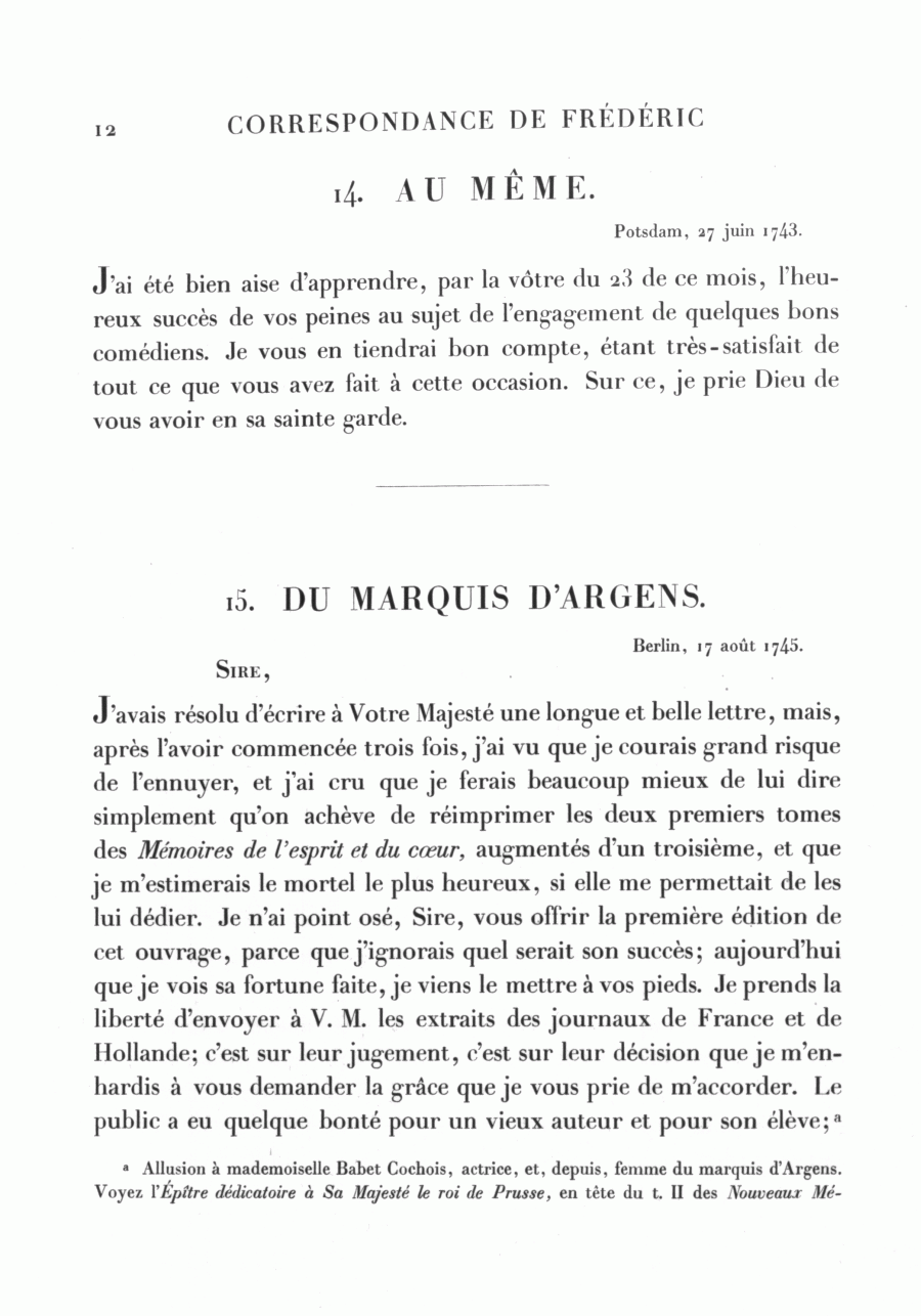a Allusion à mademoiselle Babet Cochois, actrice, et, depuis, femme du marquis d'Argens. Voyez l'Épître dédicatoire à Sa Majesté le roi de Prusse, en tète du t. II des Nouveaux Mémoires pour servir à l'histoire de l'esprit et du cœur, par le marquis d'Argens et par mademoiselle Cochois. A la Haye, 1746, p. II, IV et V.