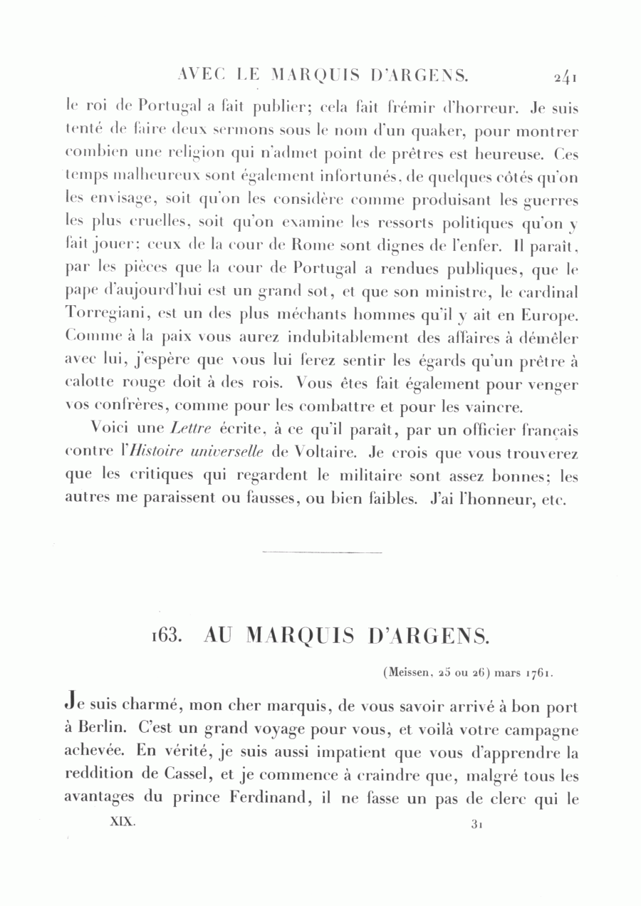 <241> le roi de Portugal a fait publier; cela fait frémir d'horreur. Je suis tenté de faire deux sermons sous le nom d'un quaker, pour montrer combien une religion qui n'admet point de prêtres est heureuse. Ces temps malheureux sont également infortunés, de quelques côtés qu'on les envisage, soit qu'on les considère comme produisant les guerres les plus cruelles, soit qu'on examine les ressorts politiques qu'on y fait jouer : ceux de la cour de Rome sont dignes de l'enfer. Il paraît, par les pièces que la cour de Portugal a rendues publiques, que le pape d'aujourd'hui est un grand sot, et que son ministre, le cardinal Torregiani, est un des plus méchants hommes qu'il y ait en Europe. Comme à la paix vous aurez indubitablement des affaires à démêler avec lui, j'espère que vous lui ferez sentir les égards qu'un prêtre à calotte rouge doit à des rois. Vous êtes fait également pour venger vos confrères, comme pour les combattre et pour les vaincre.