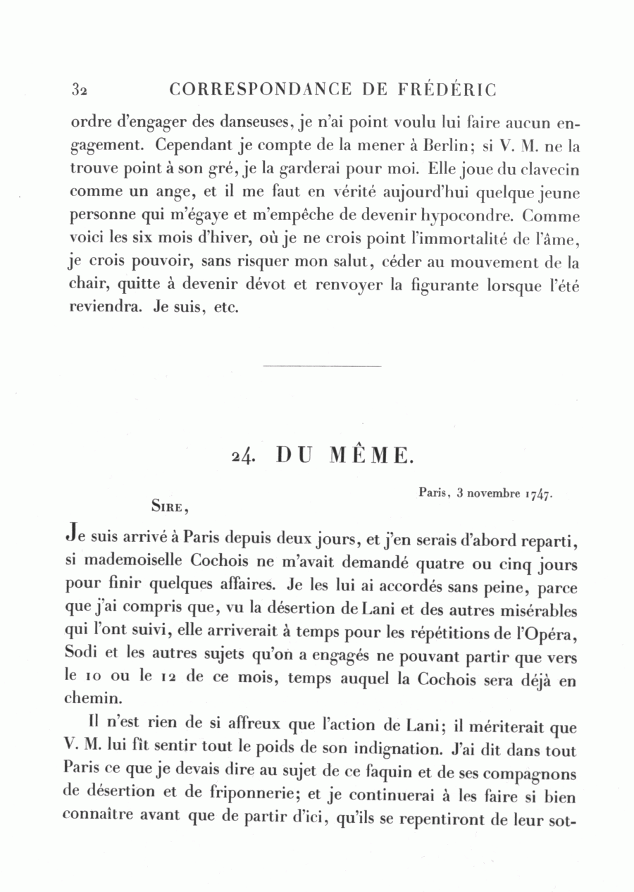 <32> ordre d'engager des danseuses, je n'ai point voulu lui faire aucun engagement. Cependant je compte de la mener à Berlin; si V. M. ne la trouve point à son gré, je la garderai pour moi. Elle joue du clavecin comme un ange, et il me faut en vérité aujourd'hui quelque jeune personne qui m'égaye et m'empêche de devenir hypocondre. Comme voici les six mois d'hiver, où je ne crois point l'immortalité de l'âme, je crois pouvoir, sans risquer mon salut, céder au mouvement de la chair, quitte à devenir dévot et renvoyer la figurante lorsque l'été reviendra. Je suis, etc.