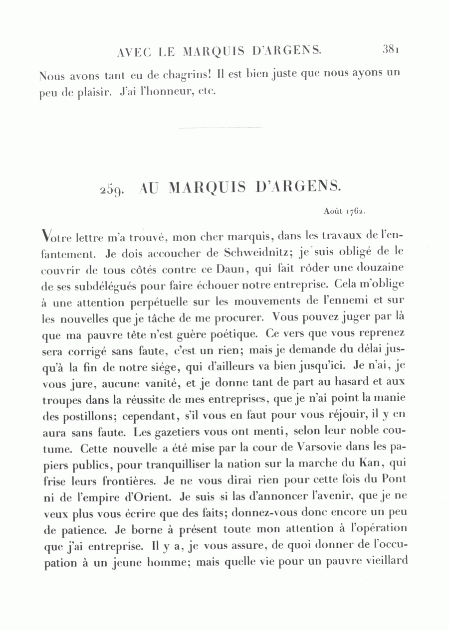 Votre lettre m'a trouvé, mon cher marquis, dans les travaux de l'enfantement. Je dois accoucher de Schweidnitz; je suis obligé de le couvrir de tous côtés contre ce Daun, qui fait rôder une douzaine de ses subdélégués pour faire échouer notre entreprise. Cela m'oblige à une attention perpétuelle sur les mouvements de l'ennemi et sur les nouvelles que je tâche de me procurer. Vous pouvez juger par là que ma pauvre tête n'est guère poétique. Ce vers que vous reprenez sera corrigé sans faute, c'est un rien; mais je demande du délai jusqu'à la fin de notre siége, qui d'ailleurs va bien jusqu'ici. Je n'ai, je vous jure, aucune vanité, et je donne tant de part au hasard et aux troupes dans la réussite de mes entreprises, que je n'ai point la manie des postillons; cependant, s'il vous en faut pour vous réjouir, il y en aura sans faute. Les gazetiers vous ont menti, selon leur noble coutume. Cette nouvelle a été mise par la cour de Varsovie dans les papiers publics, pour tranquilliser la nation sur la marche du Kan, qui frise leurs frontières. Je ne vous dirai rien pour cette fois du Pont ni de l'empire d'Orient. Je suis si las d'annoncer l'avenir, que je ne veux plus vous écrire que des faits; donnez-vous donc encore un peu de patience. Je borne à présent toute mon attention à l'opération que j'ai entreprise. Il y a, je vous assure, de quoi donner de l'occupation à un jeune homme; mais quelle vie pour un pauvre vieillard