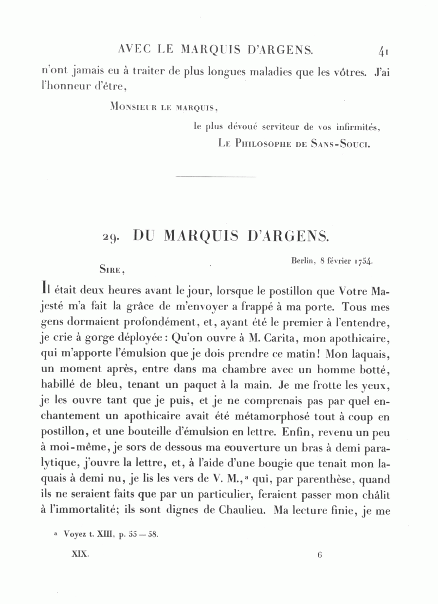 Il était deux heures avant le jour, lorsque le postillon que Votre Majesté m'a fait la grâce de m'envoyer a frappé à ma porte. Tous mes gens dormaient profondément, et, ayant été le premier à l'entendre, je crie à gorge déployée : Qu'on ouvre à M. Carita, mon apothicaire, qui m'apporte l'émulsion que je dois prendre ce matin! Mon laquais, un moment après, entre dans ma chambre avec un homme botté, habillé de bleu, tenant un paquet à la main. Je me frotte les yeux, je les ouvre tant que je puis, et je ne comprenais pas par quel enchantement un apothicaire avait été métamorphosé tout à coup en postillon, et une bouteille d'émulsion en lettre. Enfin, revenu un peu à moi-même, je sors de dessous ma couverture un bras à demi paralytique, j'ouvre la lettre, et, à l'aide d'une bougie que tenait mon laquais à demi nu, je lis les vers de V. M.,a qui, par parenthèse, quand ils ne seraient faits que par un particulier, feraient passer mon châlit à l'immortalité; ils sont dignes de Chaulieu. Ma lecture finie, je me