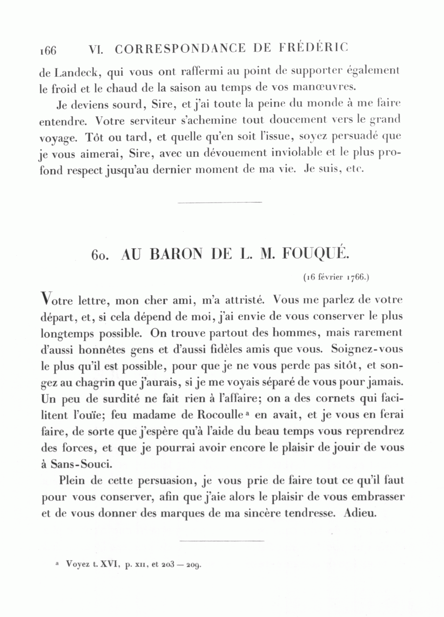 Votre lettre, mon cher ami, m'a attristé. Vous me parlez de votre départ, et, si cela dépend de moi, j'ai envie de vous conserver le plus longtemps possible. On trouve partout des hommes, mais rarement d'aussi honnêtes gens et d'aussi fidèles amis que vous. Soignez-vous le plus qu'il est possible, pour que je ne vous perde pas sitôt, et songez au chagrin que j'aurais, si je me voyais séparé de vous pour jamais. Un peu de surdité ne fait rien à l'affaire; on a des cornets qui facilitent l'ouïe; feu madame de Rocoullea en avait, et je vous en ferai faire, de sorte que j'espère qu'à l'aide du beau temps vous reprendrez des forces, et que je pourrai avoir encore le plaisir de jouir de vous à Sans-Souci.