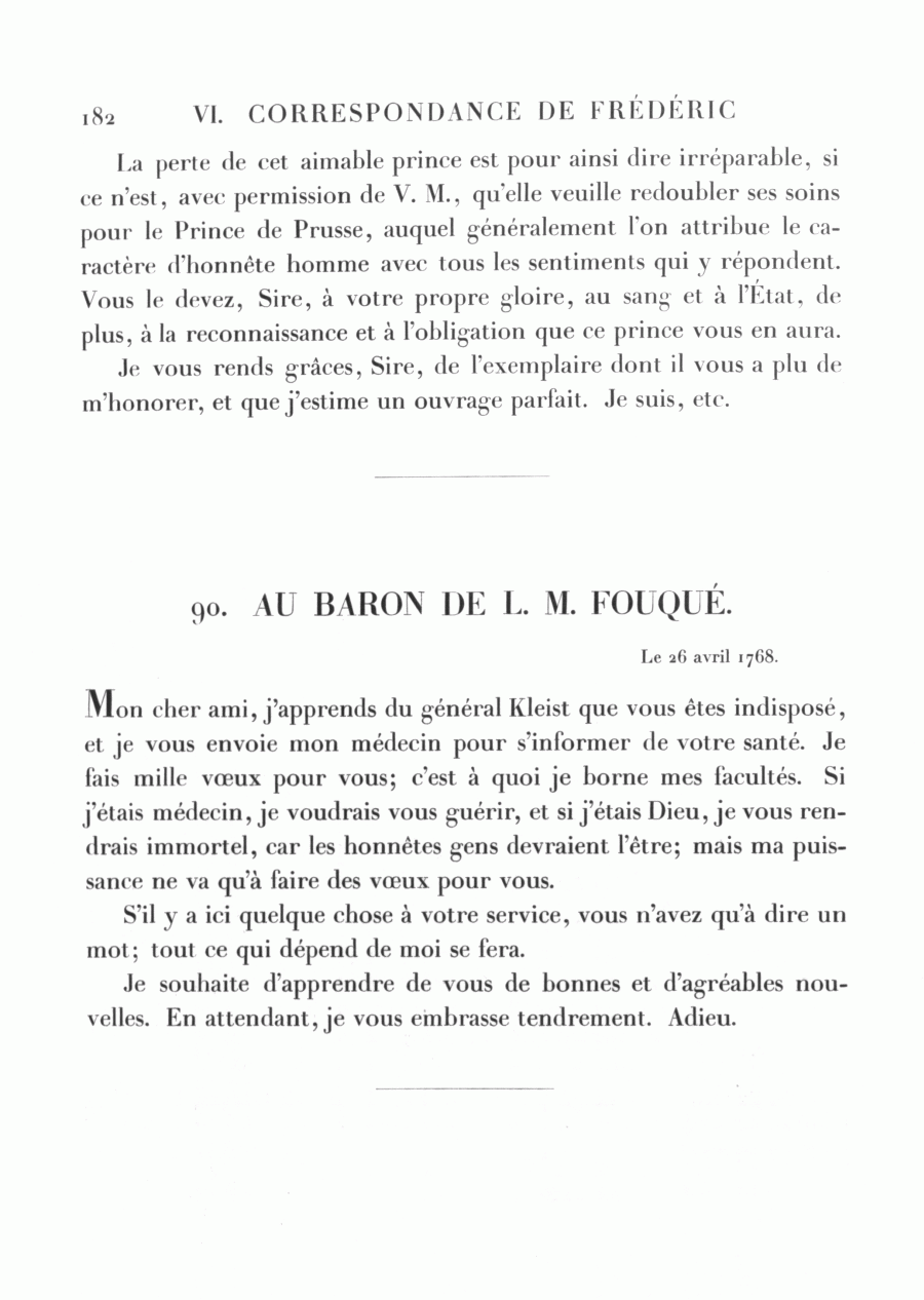 Mon cher ami, j'apprends du général Kleist que vous êtes indisposé, et je vous envoie mon médecin pour s'informer de votre santé. Je fais mille vœux pour vous; c'est à quoi je borne mes facultés. Si j'étais médecin, je voudrais vous guérir, et si j'étais Dieu, je vous rendrais immortel, car les honnêtes gens devraient l'être; mais ma puissance ne va qu'à faire des vœux pour vous.