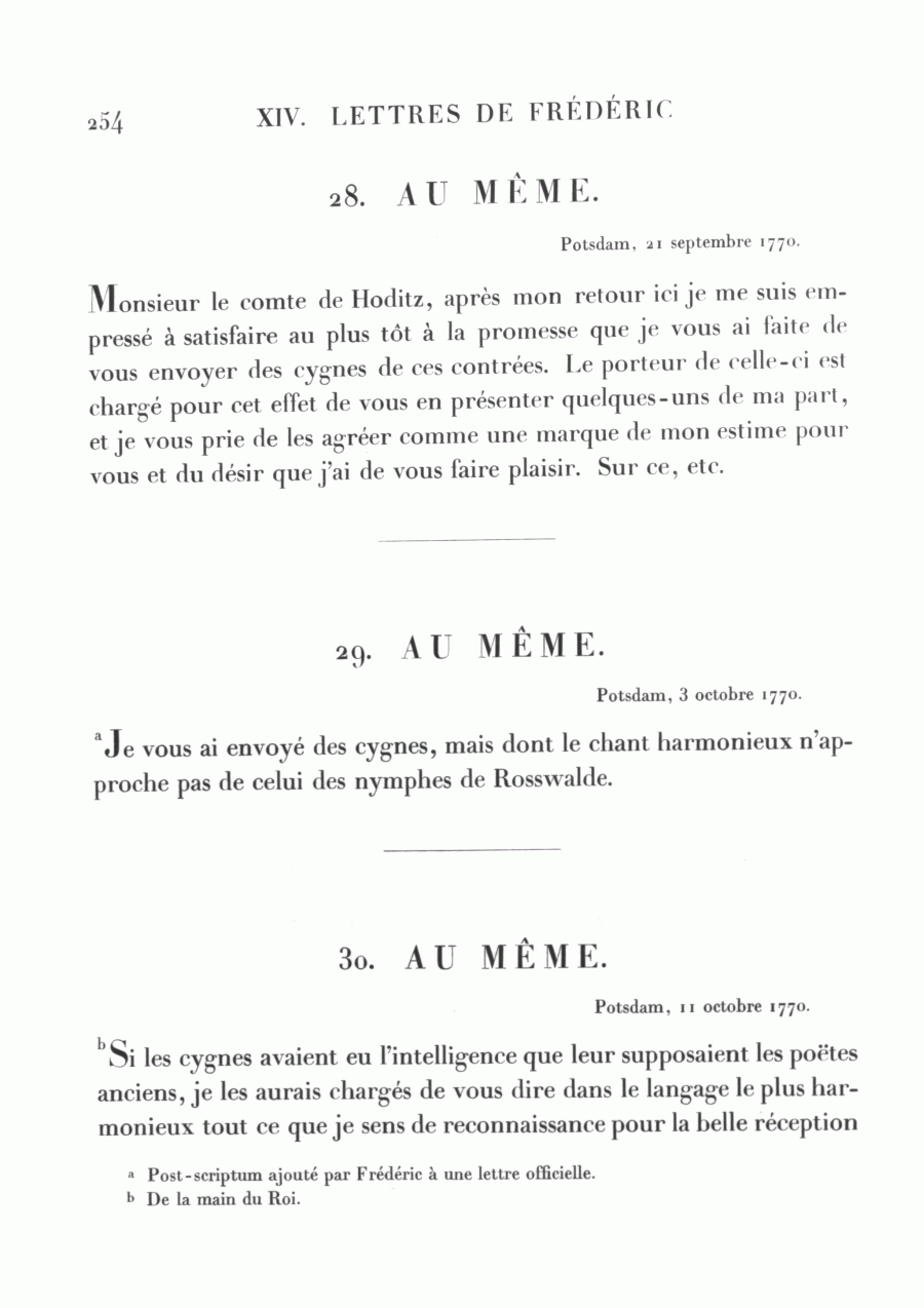 Monsieur le comte de Hoditz, après mon retour ici je me suis empressé à satisfaire au plus tôt à la promesse que je vous ai faite de vous envoyer des cygnes de ces contrées. Le porteur de celle-ci est chargé pour cet effet de vous en présenter quelques-uns de ma part, et je vous prie de les agréer comme une marque de mon estime pour vous et du désir que j'ai de vous faire plaisir. Sur ce, etc.