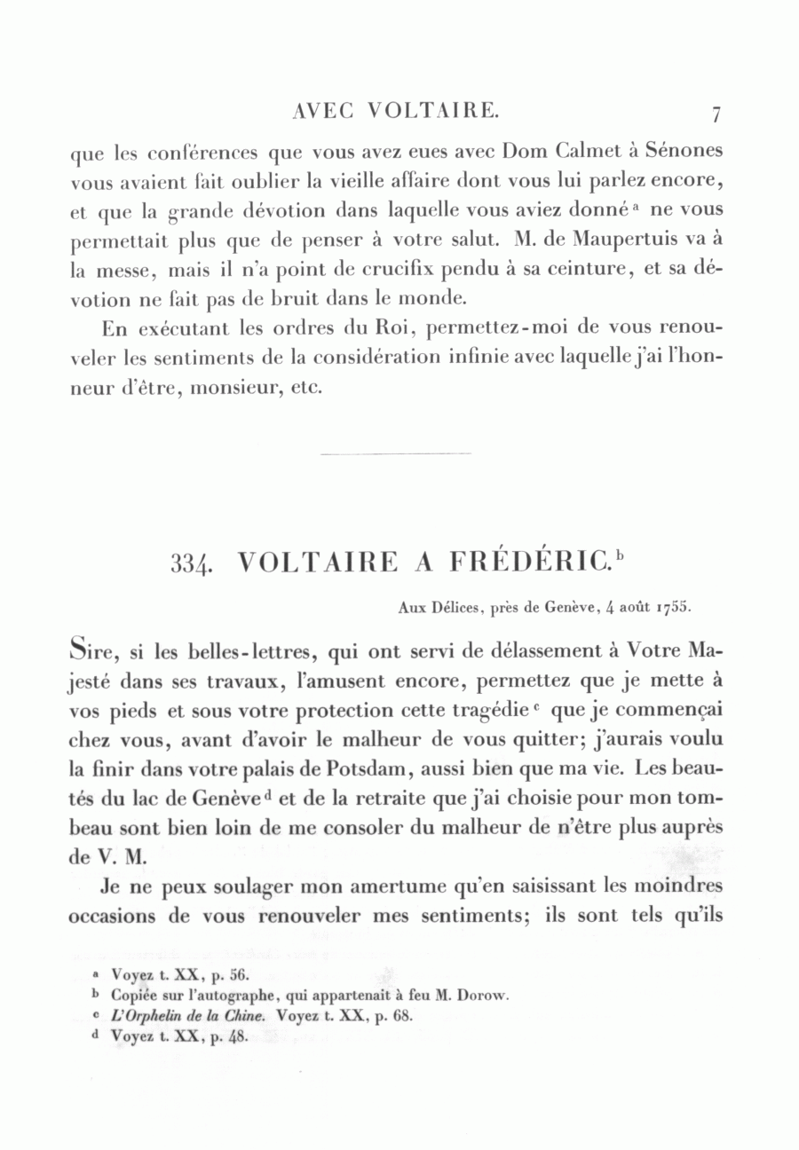 Sire, si les belles-lettres, qui ont servi de délassement à Votre Majesté dans ses travaux, l'amusent encore, permettez que je mette à vos pieds et sous votre protection cette tragédiec que je commençai chez vous, avant d'avoir le malheur de vous quitter; j'aurais voulu la finir dans votre palais de Potsdam, aussi bien que ma vie. Les beautés du lac de Genèved et de la retraite que j'ai choisie pour mon tombeau sont bien loin de me consoler du malheur de n'être plus auprès de V. M.
