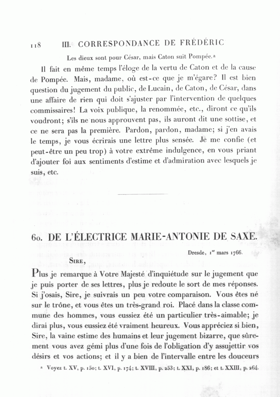 Plus je remarque à Votre Majesté d'inquiétude sur le jugement que je puis porter de ses lettres, plus je redoute le sort de mes réponses. Si j'osais, Sire, je suivrais un peu votre comparaison. Vous êtes né sur le trône, et vous êtes un très-grand roi. Placé dans la classe commune des hommes, vous eussiez été un particulier très-aimable; je dirai plus, vous eussiez été vraiment heureux. Vous appréciez si bien, Sire, la vaine estime des humains et leur jugement bizarre, que sûrement vous avez gémi plus d'une fois de l'obligation d'y assujettir vos désirs et vos actions; et il y a bien de l'intervalle entre les douceurs