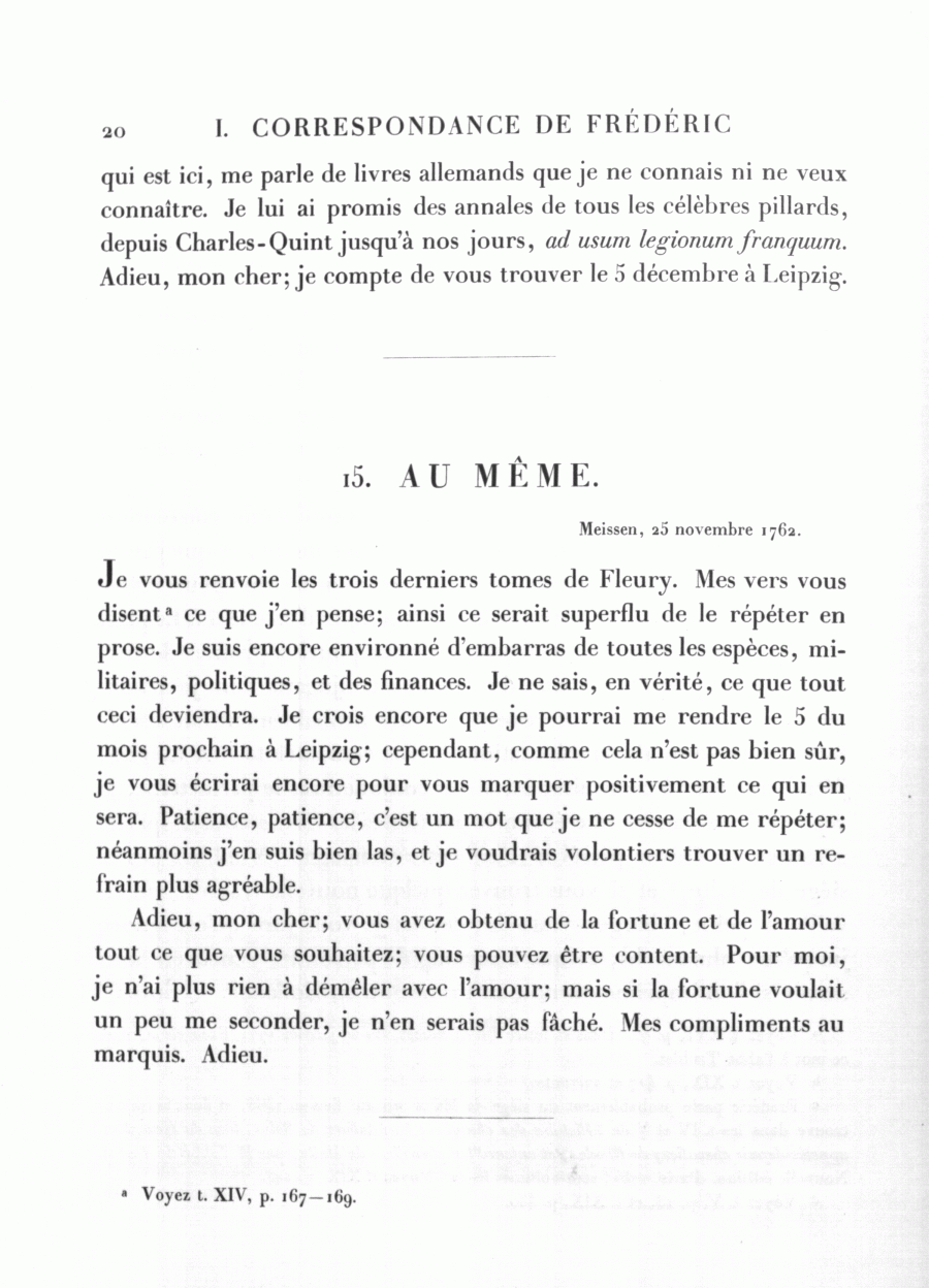 Je vous renvoie les trois derniers tomes de Fleury. Mes vers vous disenta ce que j'en pense; ainsi ce serait superflu de le répéter en prose. Je suis encore environné d'embarras de toutes les espèces, militaires, politiques, et des finances. Je ne sais, en vérité, ce que tout ceci deviendra. Je crois encore que je pourrai me rendre le 5 du mois prochain à Leipzig; cependant, comme cela n'est pas bien sûr, je vous écrirai encore pour vous marquer positivement ce qui en sera. Patience, patience, c'est un mot que je ne cesse de me répéter; néanmoins j'en suis bien las, et je voudrais volontiers trouver un refrain plus agréable.