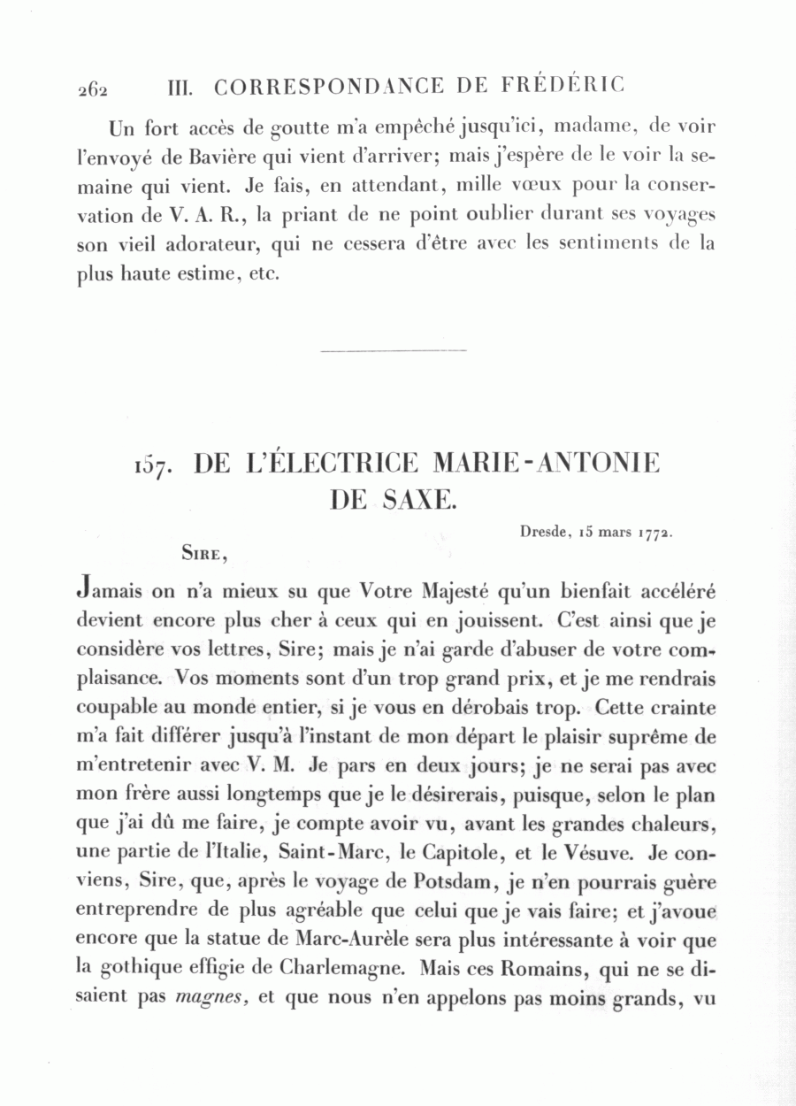 Jamais on n'a mieux su que Votre Majesté qu'un bienfait accéléré devient encore plus cher à ceux qui en jouissent. C'est ainsi que je considère vos lettres, Sire; mais je n'ai garde d'abuser de votre complaisance. Vos moments sont d'un trop grand prix, et je me rendrais coupable au monde entier, si je vous en dérobais trop. Cette crainte m'a fait différer jusqu'à l'instant de mon départ le plaisir suprême de m'entretenir avec V. M. Je pars en deux jours; je ne serai pas avec mon frère aussi longtemps que je le désirerais, puisque, selon le plan que j'ai dû me faire, je compte avoir vu, avant les grandes chaleurs, une partie de l'Italie, Saint-Marc, le Capitole, et le Vésuve. Je conviens, Sire, que, après le voyage de Potsdam, je n'en pourrais guère entreprendre de plus agréable que celui que je vais faire; et j'avoue encore que la statue de Marc-Aurèle sera plus intéressante à voir que la gothique effigie de Charlemagne. Mais ces Romains, qui ne se disaient pas magnes, et que nous n'en appelons pas moins grands, vu