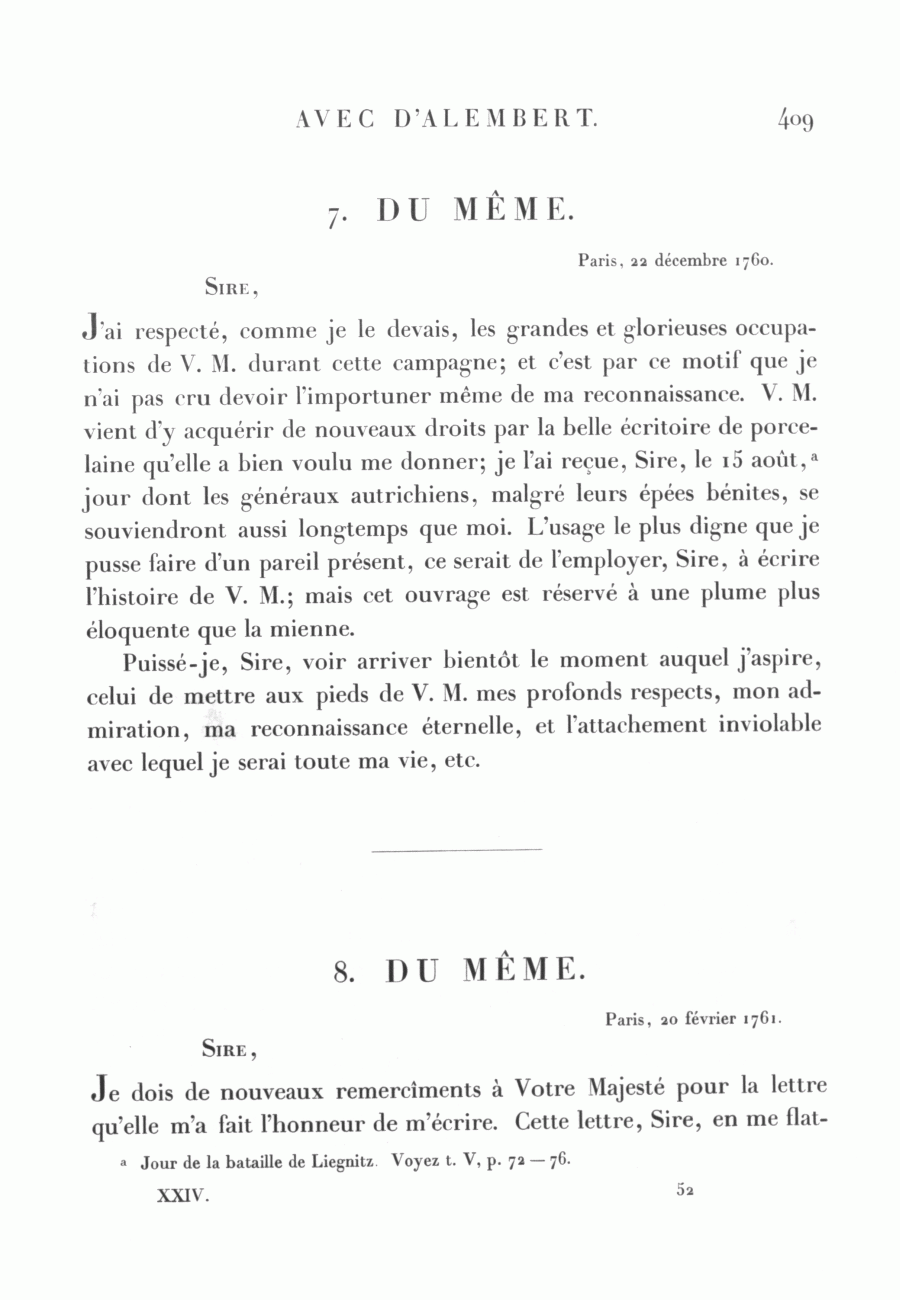 J'ai respecté, comme je le devais, les grandes et glorieuses occupations de V. M. durant cette campagne; et c'est par ce motif que je n'ai pas cru devoir l'importuner même de ma reconnaissance. V. M. vient d'y acquérir de nouveaux droits par la belle écritoire de porcelaine qu'elle a bien voulu me donner; je l'ai reçue, Sire, le 15 août,a jour dont les généraux autrichiens, malgré leurs épées bénites, se souviendront aussi longtemps que moi. L'usage le plus digne que je pusse faire d'un pareil présent, ce serait de l'employer, Sire, à écrire l'histoire de V. M.; mais cet ouvrage est réservé à une plume plus éloquente que la mienne.