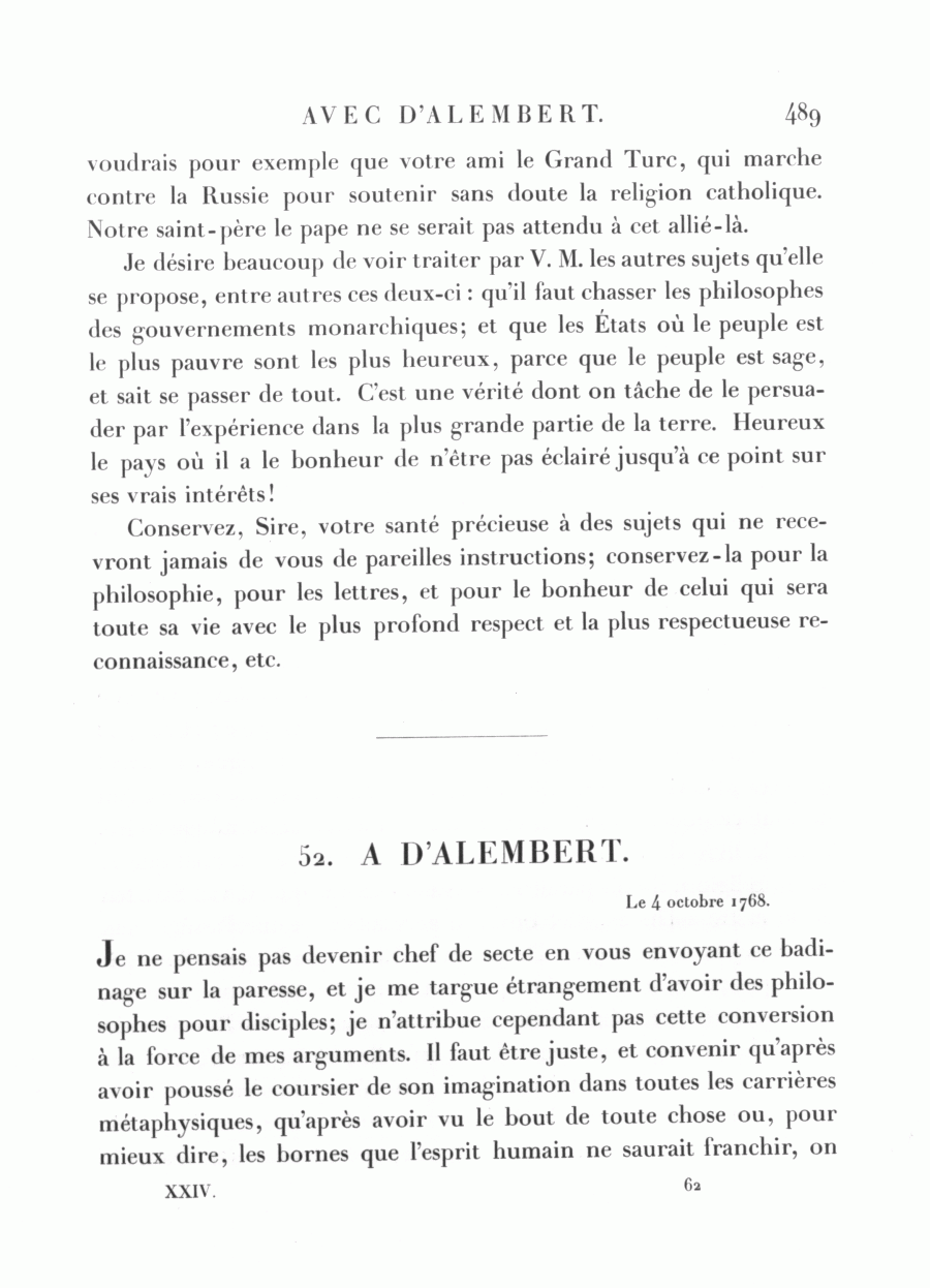 Conservez, Sire, votre santé précieuse à des sujets qui ne recevront jamais de vous de pareilles instructions; conservez-la pour la philosophie, pour les lettres, et pour le bonheur de celui qui sera toute sa vie avec le plus profond respect et la plus respectueuse reconnaissance, etc.