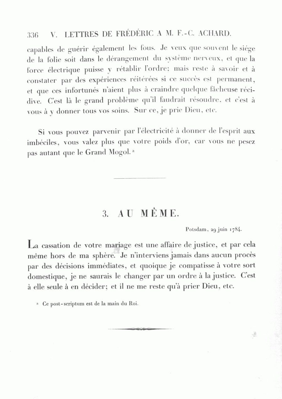 <336> capables de guérir également les fous. Je veux que souvent le siége de la folie soit dans le dérangement du système nerveux, et que la force électrique puisse y rétablir l'ordre : mais reste à savoir et à constater par des expériences réitérées si ce succès est permanent, et que ces infortunés n'aient plus à craindre quelque fâcheuse récidive. C'est là le grand problème qu'il faudrait résoudre, et c'est à vous à y donner tous vos soins. Sur ce, je prie Dieu, etc.