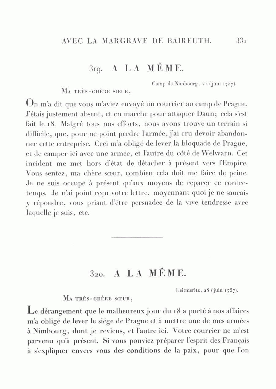 Le dérangement que le malheureux jour du 18 a porté à nos affaires m'a obligé de lever le siége de Prague et à mettre une de mes armées à Nimbourg, dont je reviens, et l'autre ici. Votre courrier ne m'est parvenu qu'à présent. Si vous pouviez préparer l'esprit des Français à s'expliquer envers vous des conditions de la paix, pour que l'on