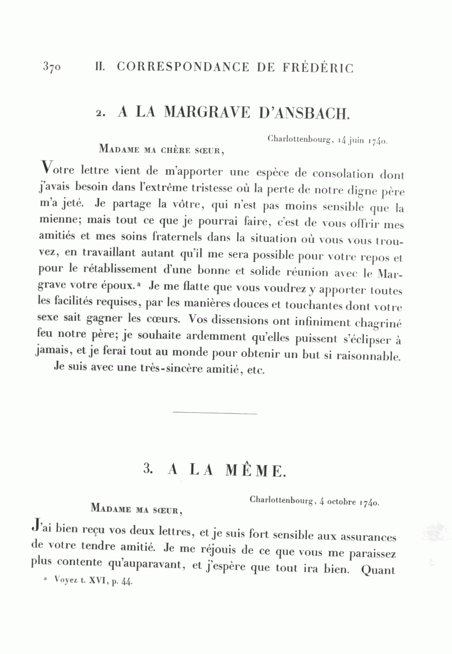 Votre lettre vient de m'apporter une espèce de consolation dont j'avais besoin dans l'extrême tristesse où la perte de notre digne père m'a jeté. Je partage la vôtre, qui n'est pas moins sensible que la mienne; mais tout ce que je pourrai faire, c'est de vous offrir mes amitiés et mes soins fraternels dans la situation où vous vous trouvez, en travaillant autant qu'il me sera possible pour votre repos et pour le rétablissement d'une bonne et solide réunion avec le Margrave votre époux.a Je me flatte que vous voudrez y apporter toutes les facilités requises, par les manières douces et touchantes dont votre sexe sait gagner les cœurs. Vos dissensions ont infiniment chagriné feu notre père; je souhaite ardemment qu'elles puissent s'éclipser à jamais, et je ferai tout au monde pour obtenir un but si raisonnable. Je suis avec une très-sincère amitié, etc.