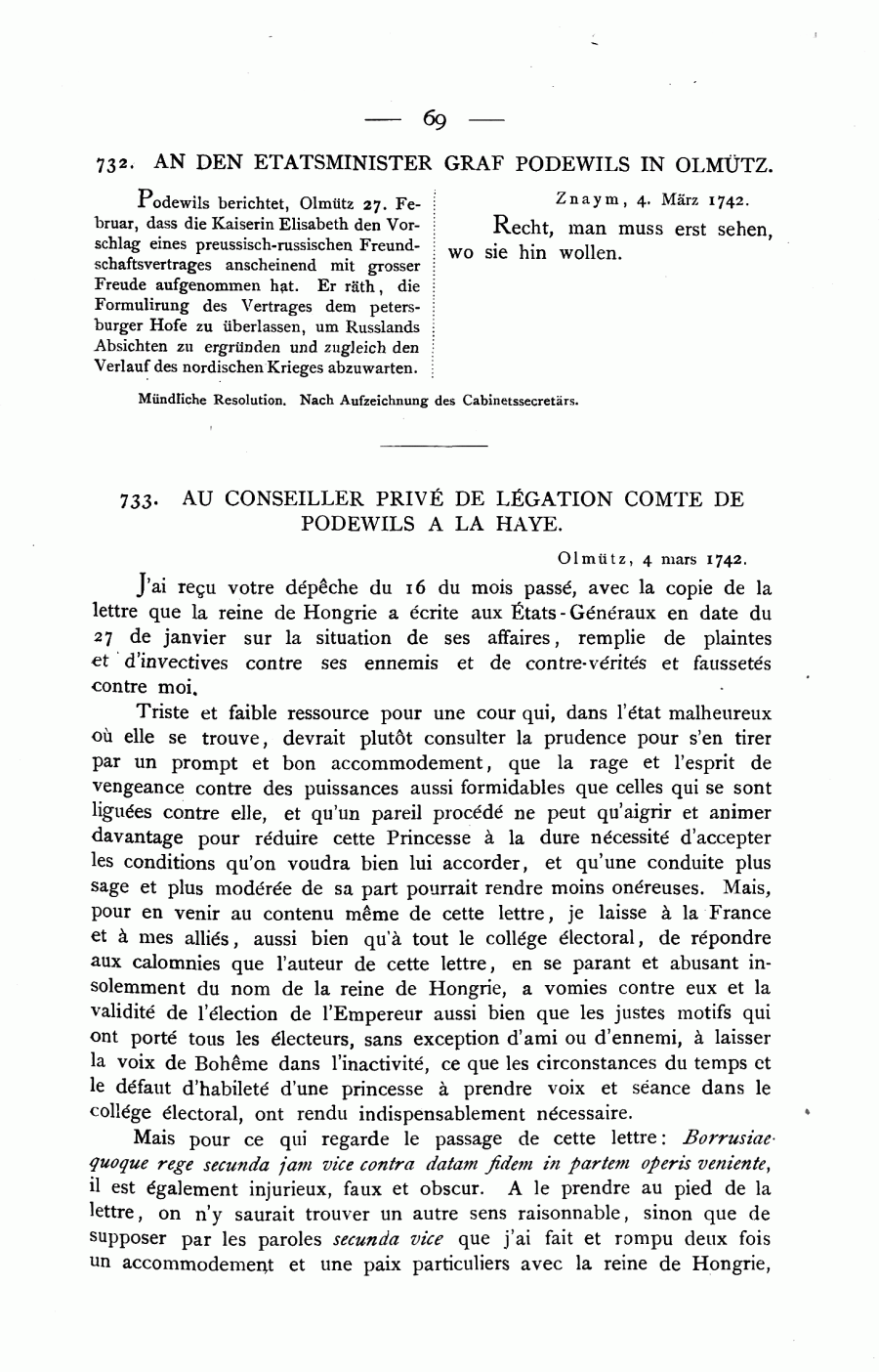 733. Au Conseiller Privé de Légation Comte de Podewils à la Haye