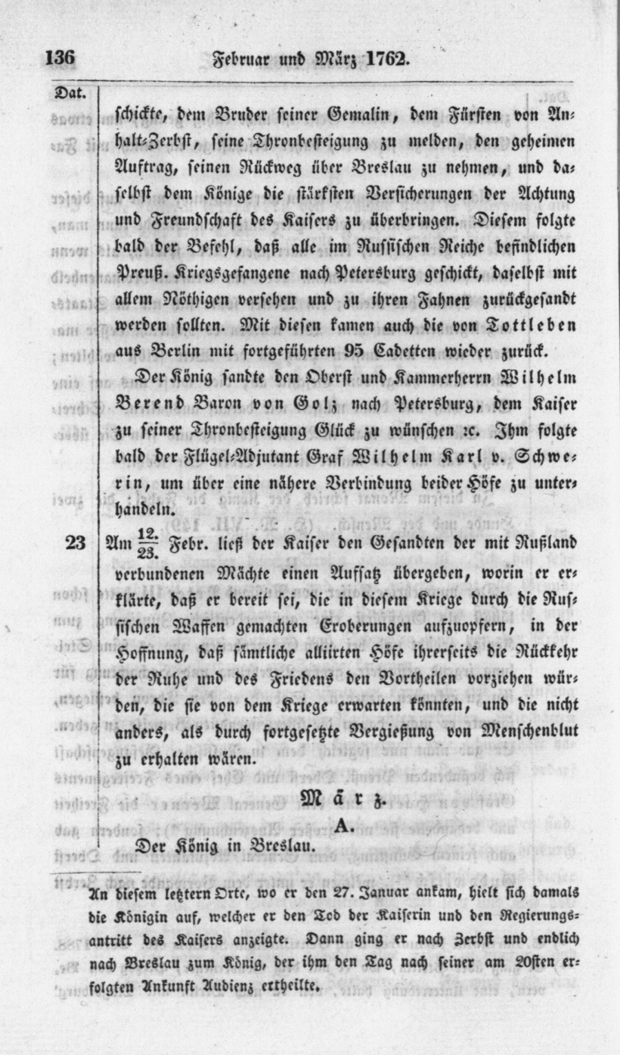 <136> schickte, dem Bruder seiner Gemalin, dem Fürsten von Anhalt-Zerbst, seine Thronbesteigung zu melden, den geheimen Auftrag, seinen Rückweg über Breslau zu nehmen, und daselbst dem Könige die stärksten Versicherungen der Achtung und Freundschaft des Kaisers zu überbringen. Diesem folgte bald der Befehl, daß alle im Russischen Reiche befindlichen Preuß. Kriegsgefangene nach Petersburg geschickt, daselbst mit allem Nöthigen versehen und zu ihren Fahnen zurückgesandt werden sollten. Mit diesen kamen auch die von Tottleben aus Berlin mit fortgeführten 95 Cadetten wieder zurück.