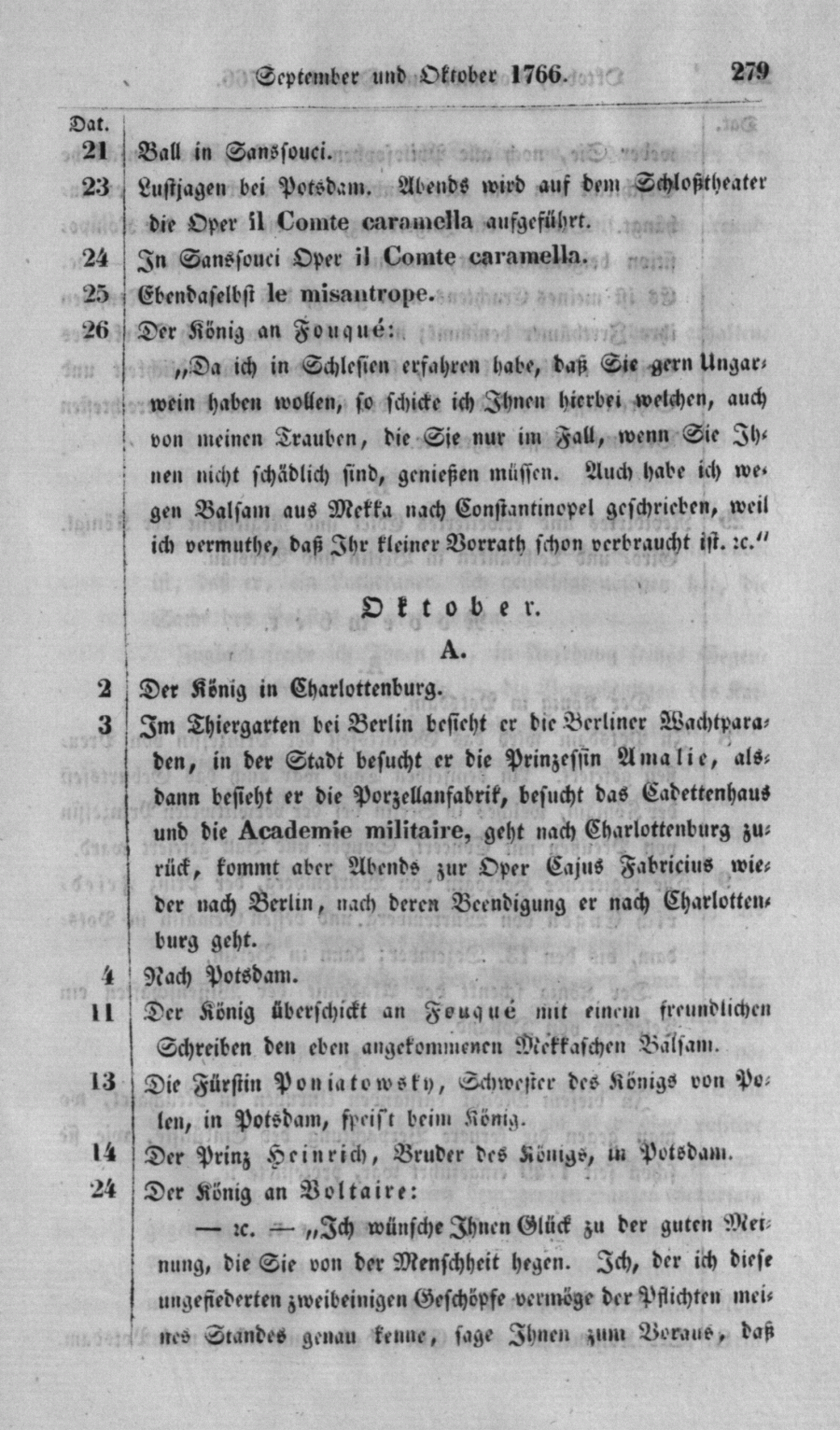 Im Thiergarten bei Berlin besieht er die Berliner Wachtparaden, in der Stadt besucht er die Prinzessin Amalie, alsdann besieht er die Porzellanfabrik, besucht das Cadettenhaus und die Academie militaire, geht nach Charlottenburg zurück, kommt aber Abends zur Oper Cajus Fabricius wieder nach Berlin, nach deren Beendigung er nach Charlottenburg geht.