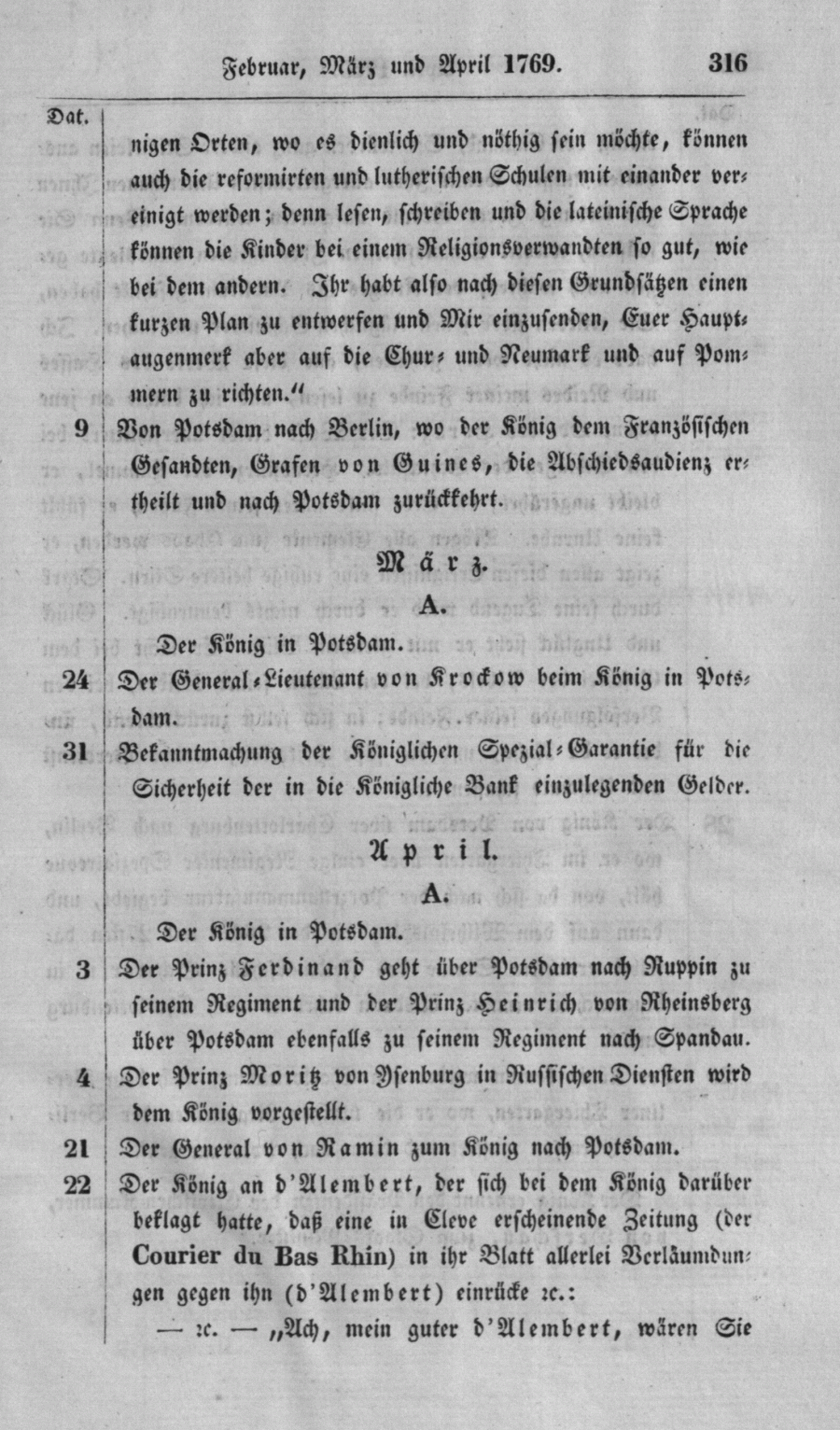 Der Prinz Ferdinand geht über Potsdam nach Ruppin zu seinem Regiment und der Prinz Heinrich von Rheinsberg über Potsdam ebenfalls zu seinem Regiment nach Spandau.
