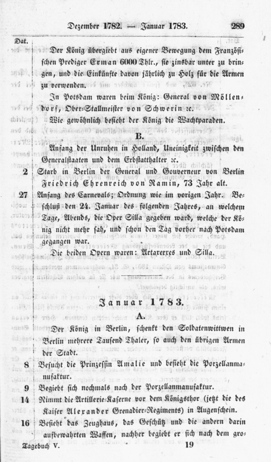 Anfang des Carnevals; Ordnung wie im vorigen Jahr. Beschluß den 24. Januar des folgenden Jahres, an welchem Tage, Abends, die Oper Silla gegeben ward, welche der König nicht mehr sah, und schon den Tag vorher nach Potsdam gegangen war.