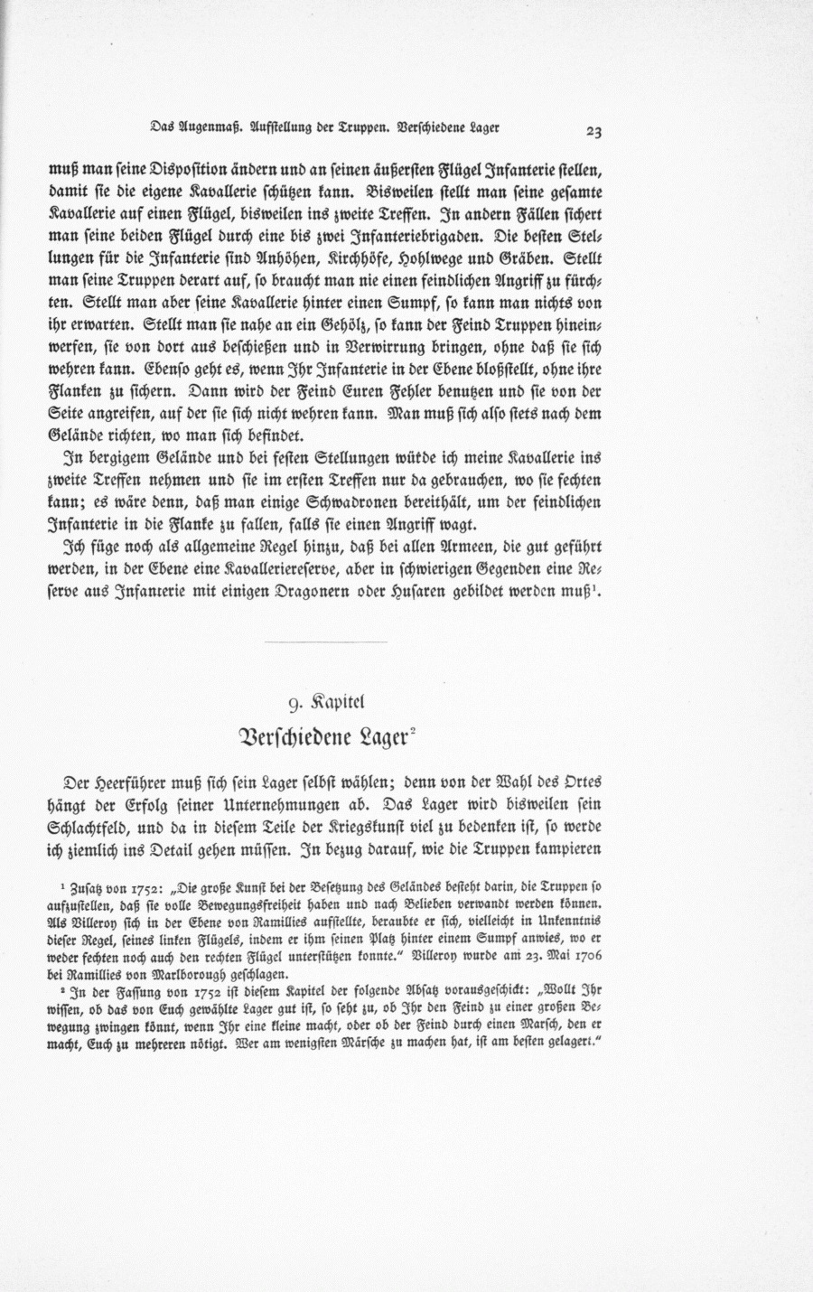 1 Zusatz von 1752: „Die große Kunst bei der Besetzung des Geländes besieht barin, die Truppen so aufzustellen, baß sie volle Bewegungsfteiheit haben und nach Belieben verwandt werden können. Als Villeroy sich in der Ebene von Ramillies aufsiellte, beraubte er sich, vielleicht in Unkenntnis dieser Regel, seines linken Flügels, indem er ihm seinen Platz hinter einem Sumpf anwies, wo er weder fechten noch auch den rechten Flügel unterstützen konnte.“ Villeroy wurde am 23. Mai 1706 bei Ramillies von Marlborough geschlagen.