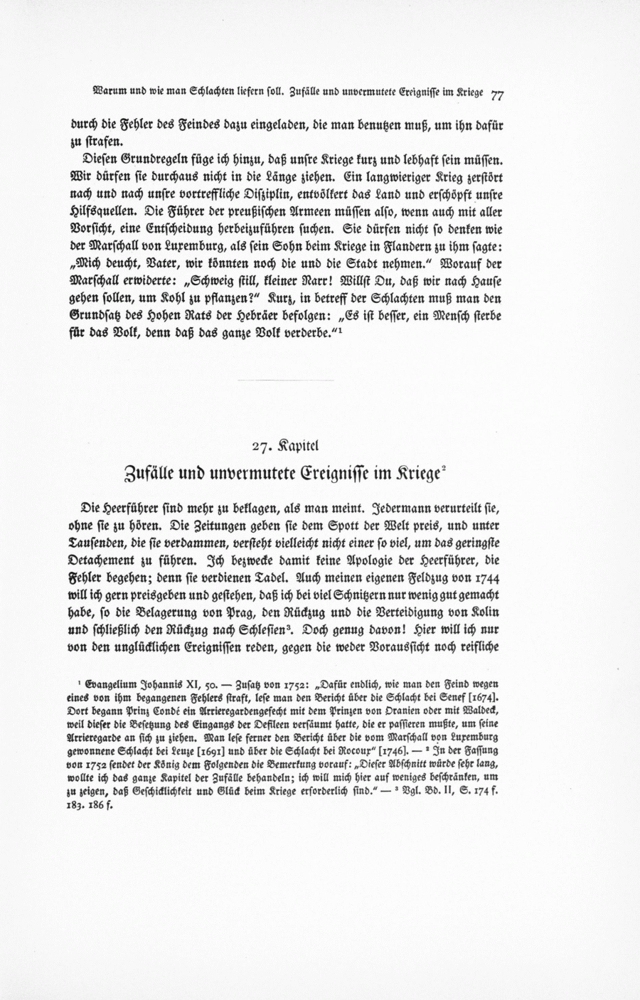 2 In der Fassung von 1752 sendet der König dem Folgenden die Bemerkung vorauf: „Dieser Abschnitt würde sehr lang, wollte ich das ganze Kapitel der Zufälle behandeln; ich will mich hier auf weniges beschränken, um zu zeigen, daß Geschicklichkeit und Glück beim Kriege erforderlich sind.“